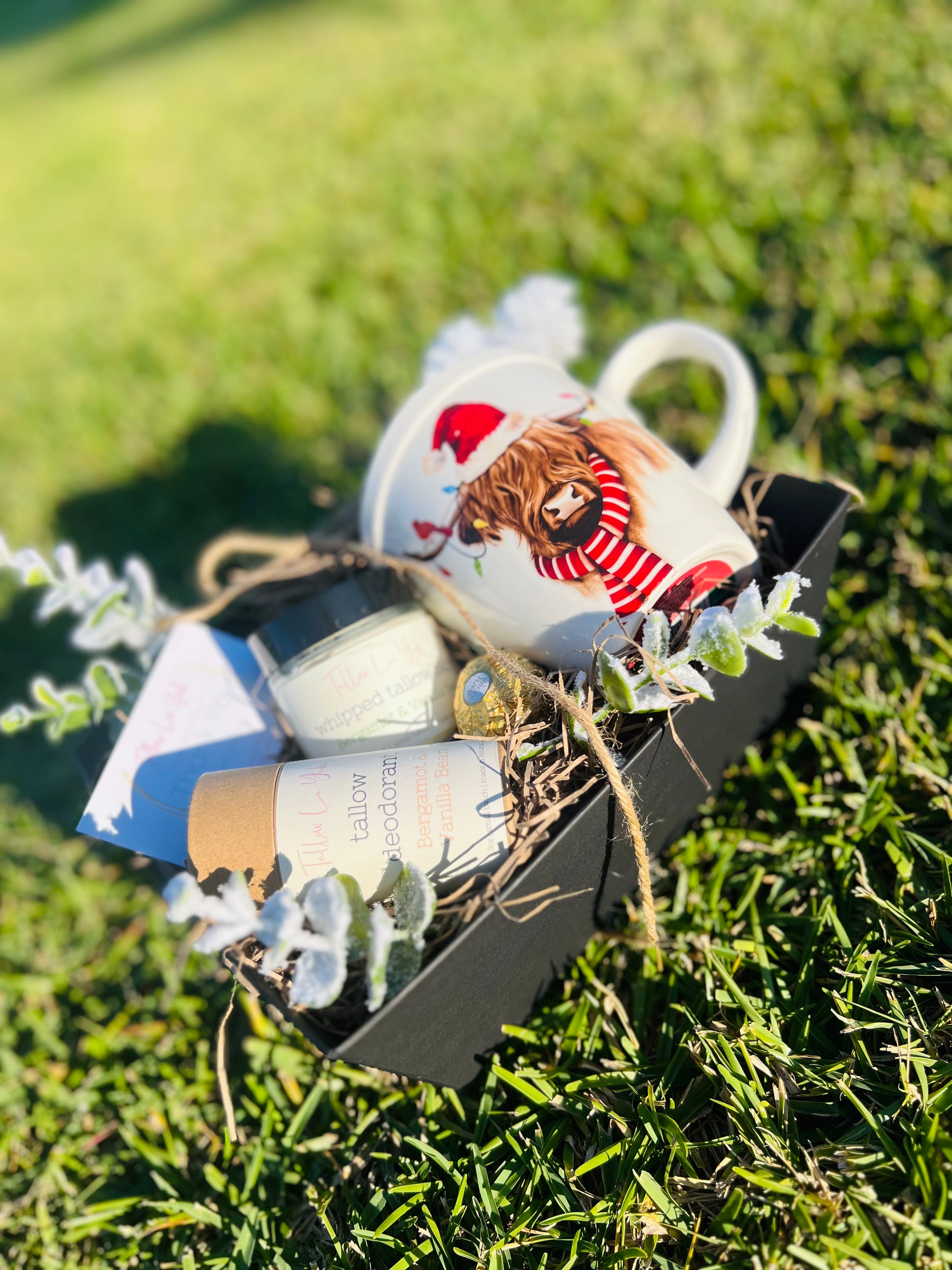 This Christmas gift box includes a cow Christmas mug, Bergamot & vanilla bean whipped tallow balm & a tallow deodorant.