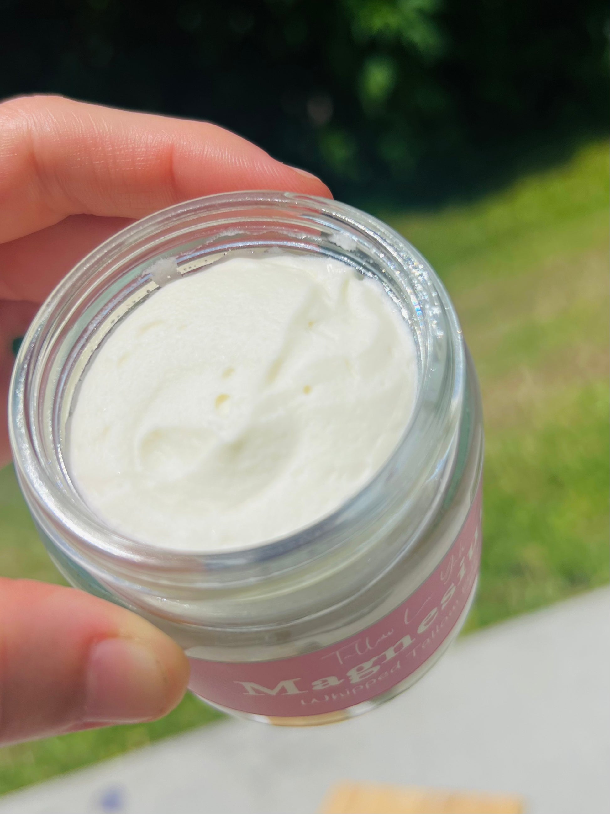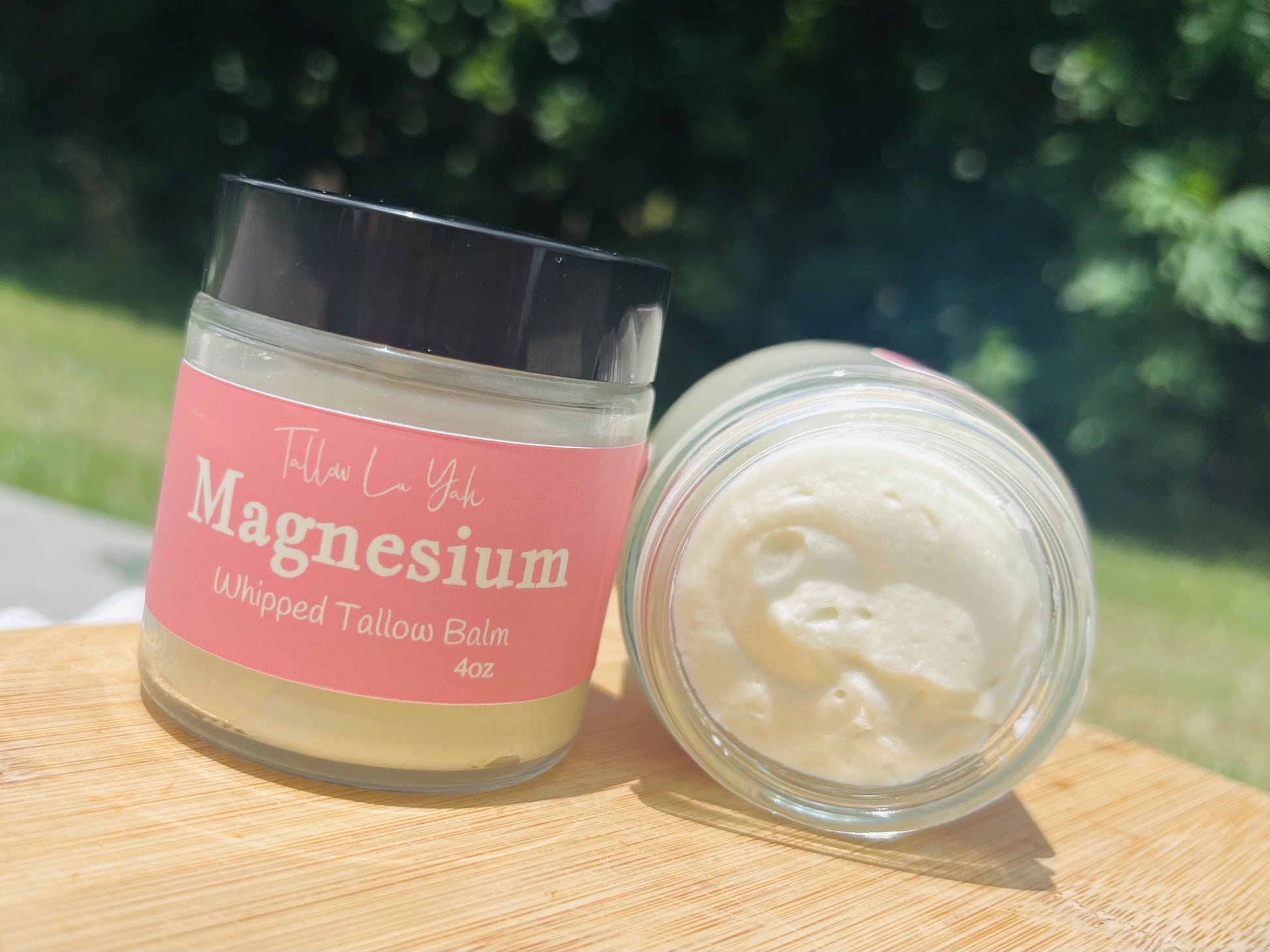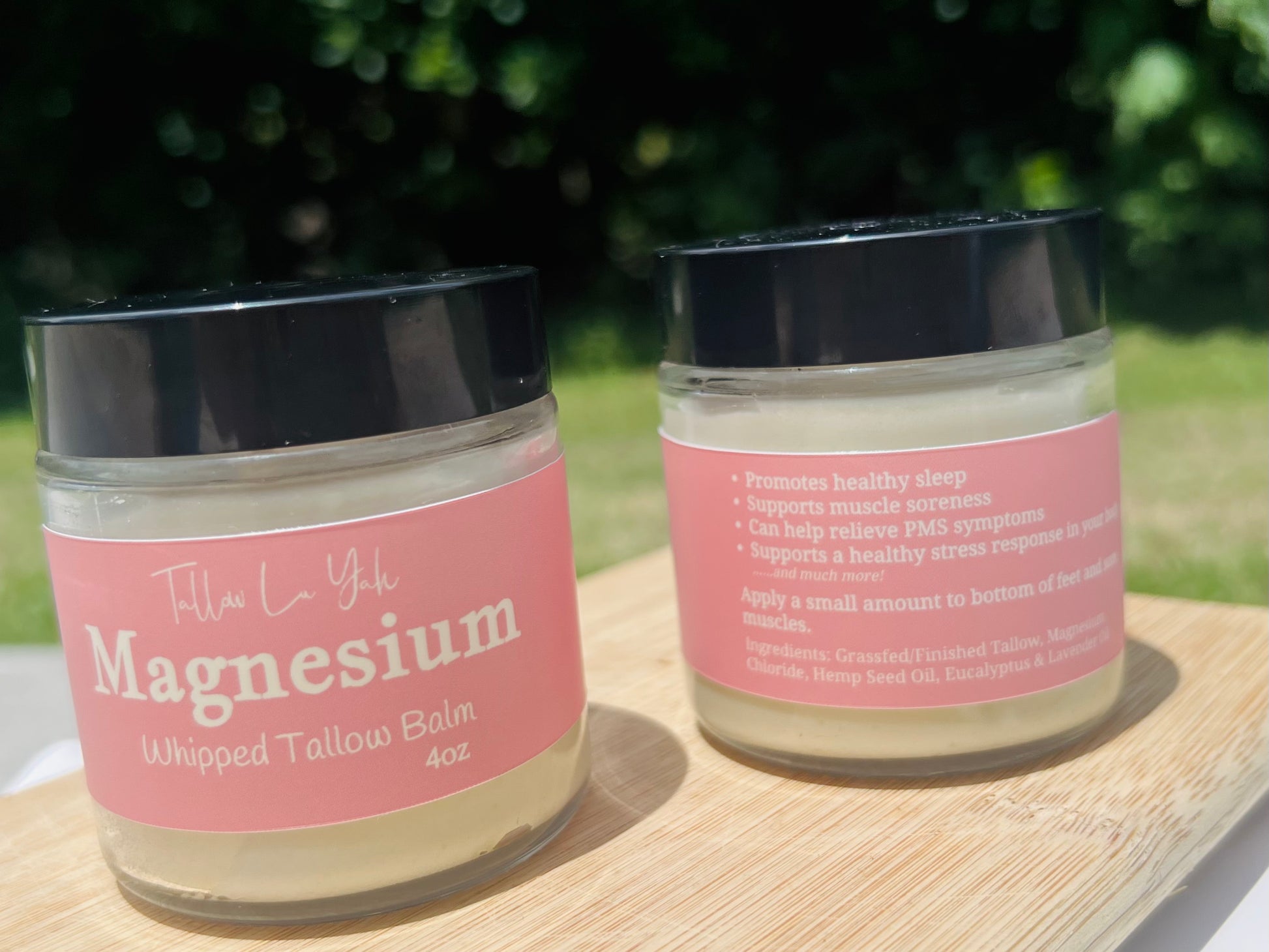 This magnesium cream is perfect duo kept on your bedside. Just a little rub on your feet before bed will insure a restful nights sleep. We use tallow as the base to not only support a healthy body, but bring moisture to the feet and other body parts as well. Magnesium is crucial for supporting the body in so many ways. It’s known to reduce stress, calm anxiety, soothe muscle cramps, ease tension, and also improves sleep quality.